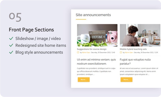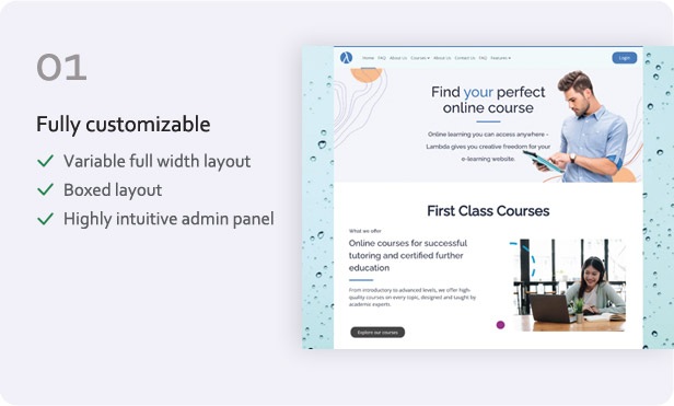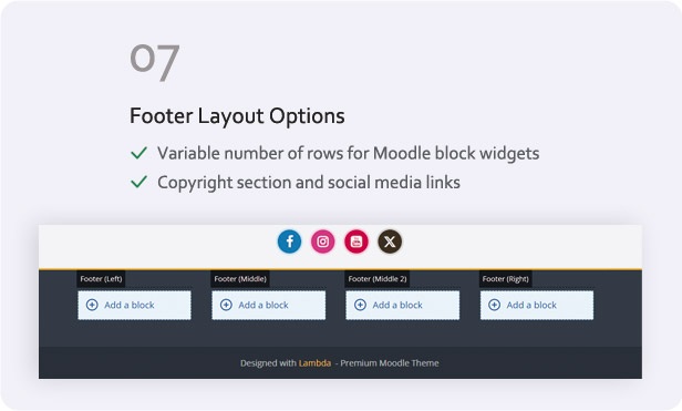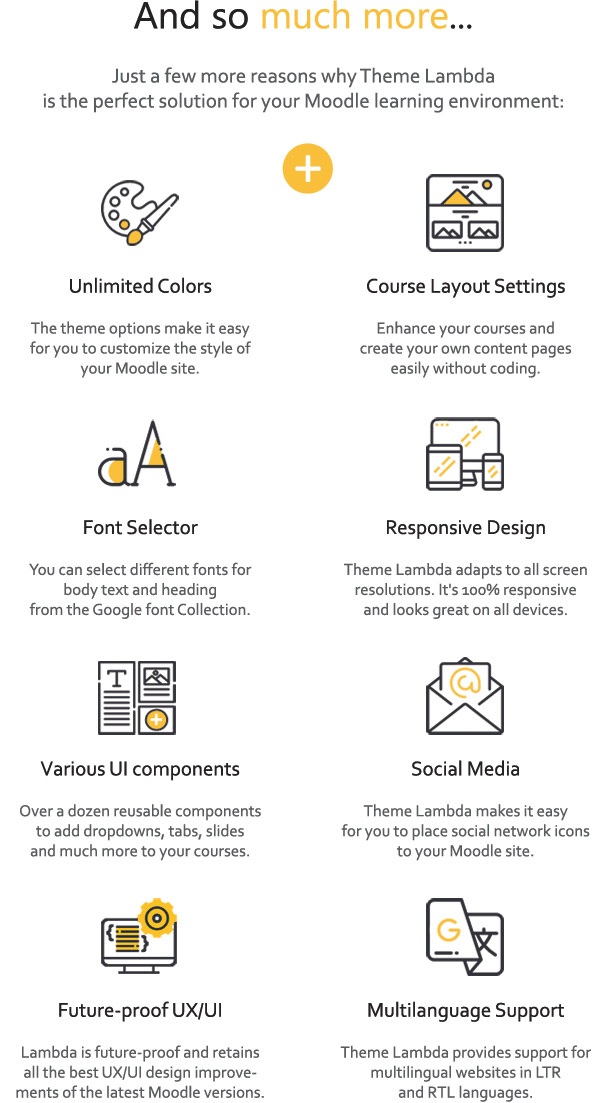Con Lambda Moodle Theme puedes crear fácilmente un sitio web moderno y llamativo para tu entorno de aprendizaje. Ofrece varias opciones y viene con muchas funciones fáciles de usar que incluyen pestañas, presentaciones de diapositivas, acordeones, cuadros de promoción e íconos vectoriales escalables.